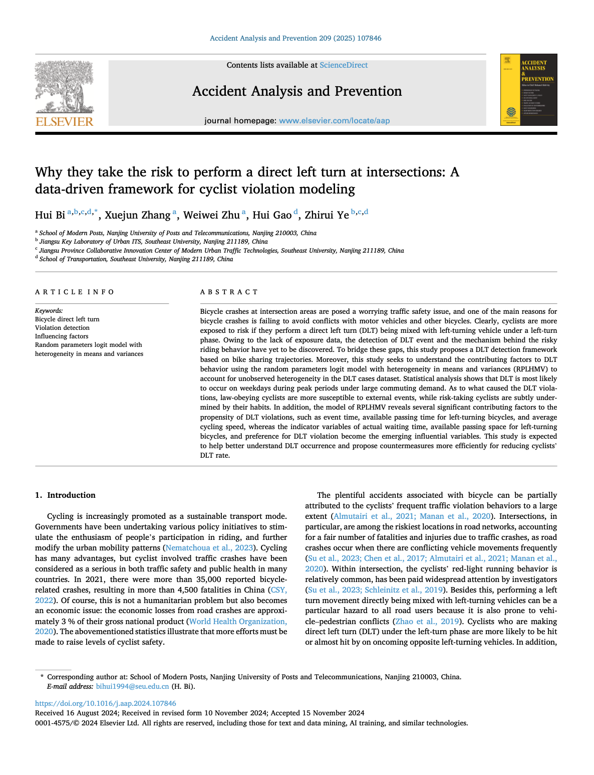 我院畢輝教授在《Accident Analysis and Prevention》發(fā)表論文